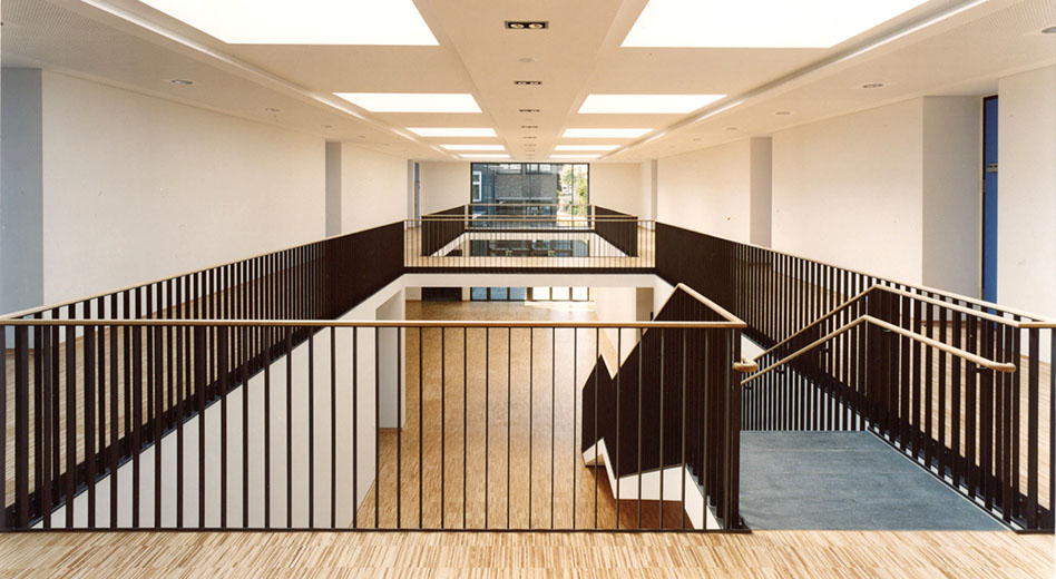 Die Anbindung wurde so gestaltet, dass die natürliche Belichtung des Bestandsgebäudes gewährleistet ist. Der zweibündige Neubau ist geprägt durch eine großzügige, zweigeschossige Erschließungshalle, die multifunktional genutzt werden kann. Raumhohe Verglasungen in den Klassenräumen schaffen sowohl eine sehr gute natürliche Belichtung, als auch einen freien Blick in die umgebende Landschaft.