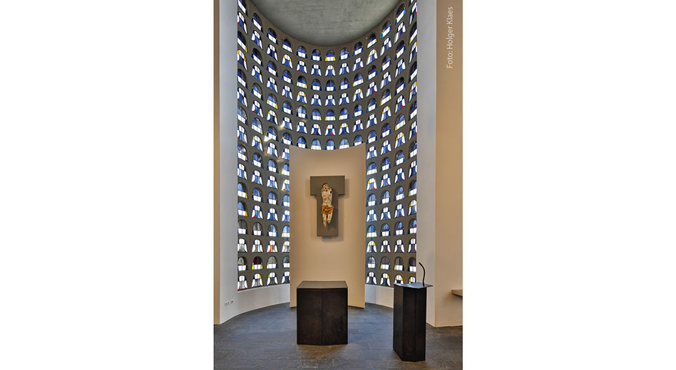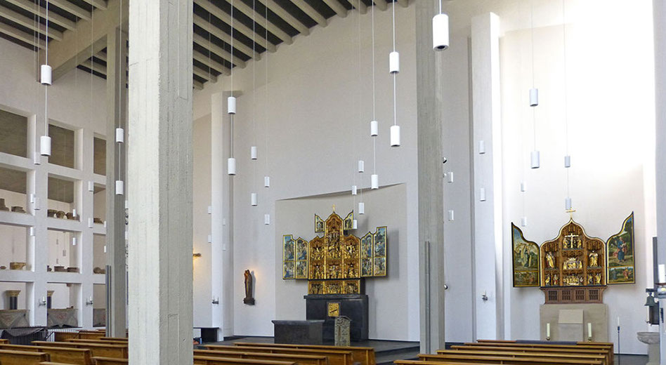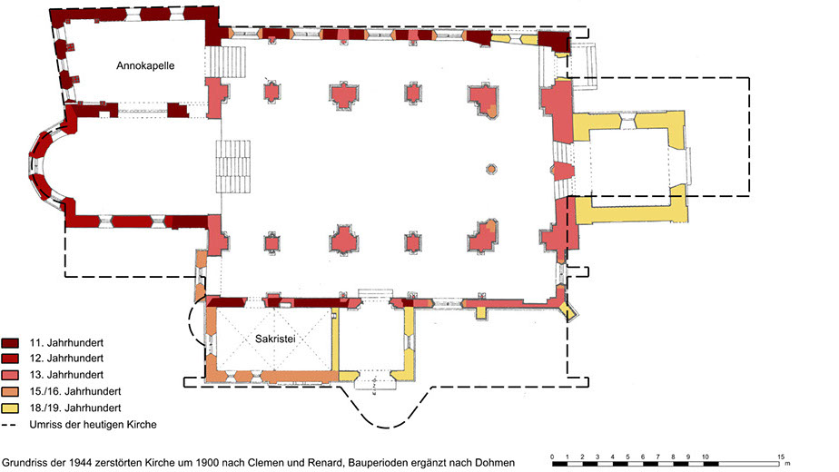 Im Jahre 1953 begann der Wiederaufbau auf der Grundlage einer Neuplanung des Kölner Architekten Karl Band. Ausdehnung und Höhenentwicklung dieses Neubaus orientierten sich am Vorgängerbau. Der Hauptraum ist gegenüber dem früheren Langhaus um 90° gedreht und nach Süden ausgerichtet. Die dem Hauptraum angegliederte Annokapelle über der Krypta fasst die Grundfläche ihrer Vorgängerin und des früheren Chores zusammen. Am Bauplatz des früheren Turmes entstand ein zweistöckiger Sakristeianbau.