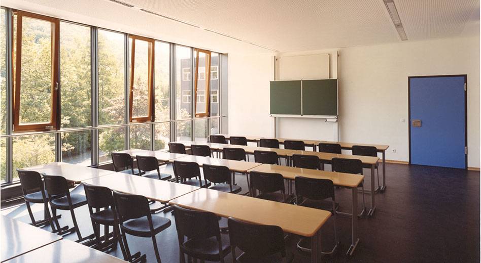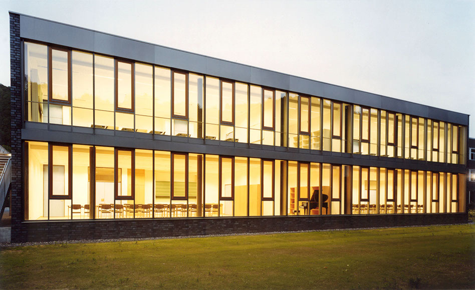 Die Anbindung wurde so gestaltet, dass die natürliche Belichtung des Bestandsgebäudes gewährleistet ist. Der zweibündige Neubau ist geprägt durch eine großzügige, zweigeschossige Erschließungshalle, die multifunktional genutzt werden kann. Raumhohe Verglasungen in den Klassenräumen schaffen sowohl eine sehr gute natürliche Belichtung, als auch einen freien Blick in die umgebende Landschaft.